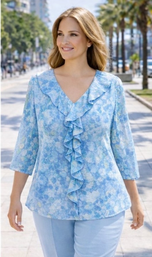 Preciosa blusa de gasa estampada en tonos azules y manga tres cuartos.