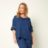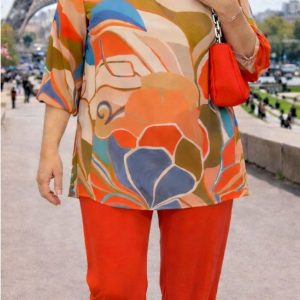 Blusón realizado en gasa con manga tres cuartos y en tonos crudos, azules y naranjas.
