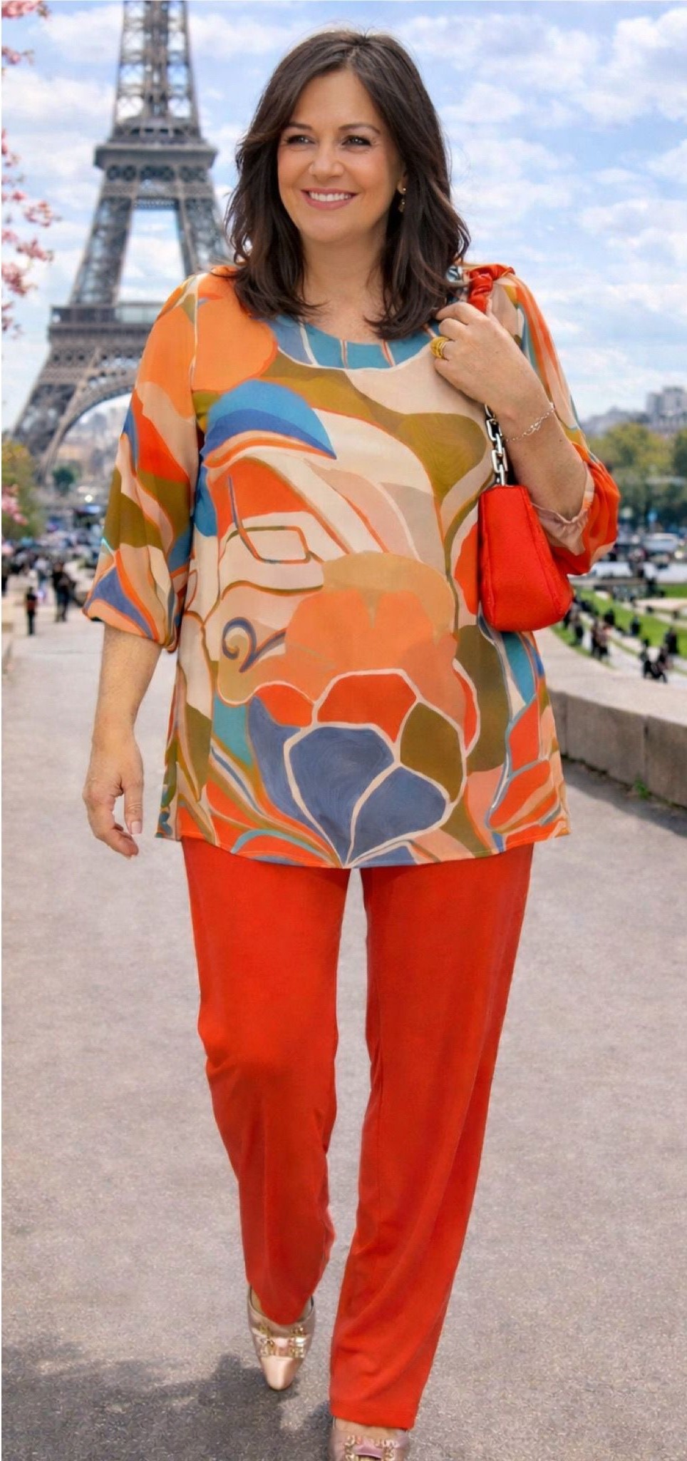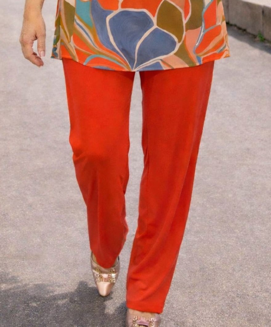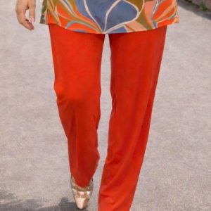 Combínalo con nuestro pantalón naranja de punto frío para crear un look juvenil y elegante.