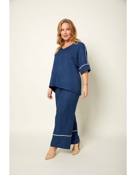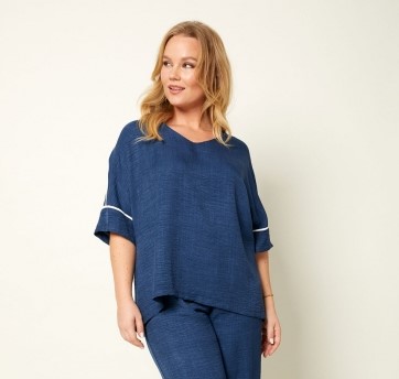 Blusa lisa en tejido tipo crepé de corte ancho, con detalles de ribete blanco en hombros y mangas. Su diseño atemporal combina con el pantalón Ruth para un look sofisticado y actual. Ideal tanto para la oficina como para planes más informales. Moda inclusiva y fabricada en España.