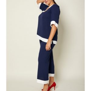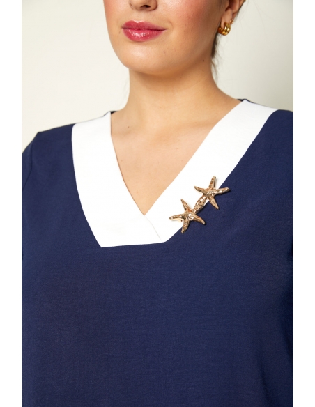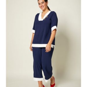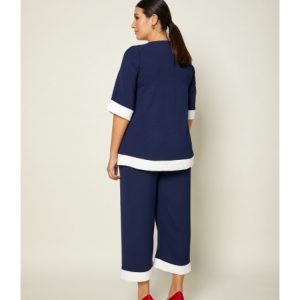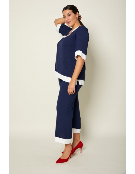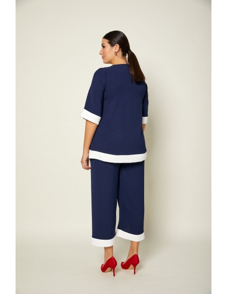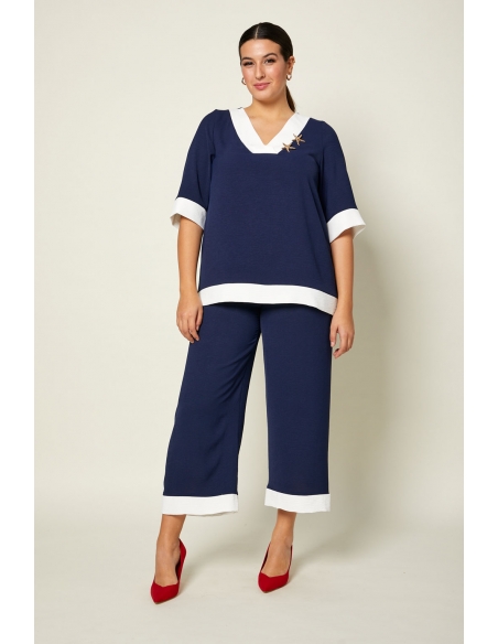 Conjunto de fiesta bicolor compuesto por blusón holgado con broche dorado removible y pantalón tobillero con goma en la cintura. Un conjunto elegante, cómodo y muy fácil de llevar, con un diseño actual que favorece en todas las tallas. Ideal para celebraciones o eventos especiales, sin renunciar a la comodidad. Fabricado en España.