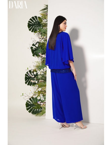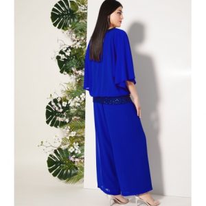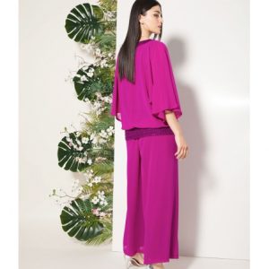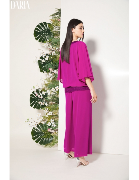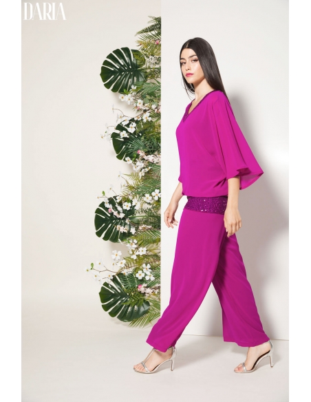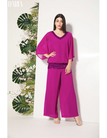 Conjunto de fiesta de dos piezas que combina sofisticación y ligereza. El blusón de gasa presenta escote y cinturilla elástica de lentejuelas, aportando un sutil brillo que realza el diseño, mientras que el forro interior garantiza comodidad. El pantalón de doble gasa, amplio y vaporoso, incorpora goma en la cintura para un ajuste confortable. Un conjunto pensado para ocasiones especiales, diseñado para acompañar el movimiento con elegancia y adaptarse a mujeres reales.