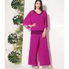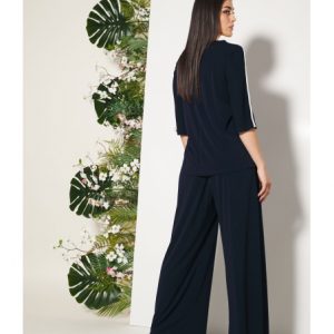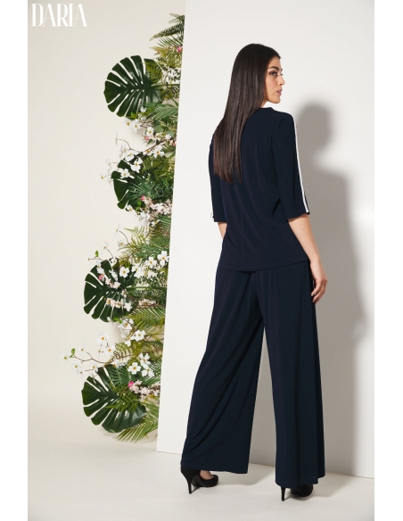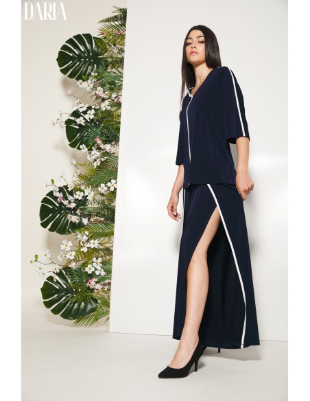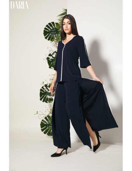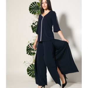Conjunto de dos piezas confeccionado en tejido de punto ligero, pensado para ofrecer comodidad sin renunciar al estilo. La camiseta de corte holgado presenta cuello pico y manga 3/4 con detalle de vivo a contraste, aportando un toque gráfico al diseño. El pantalón incorpora aberturas delanteras que estilizan la pierna y añaden movimiento al conjunto. Una propuesta versátil y actual, ideal para looks cuidados y funcionales.