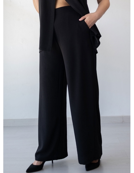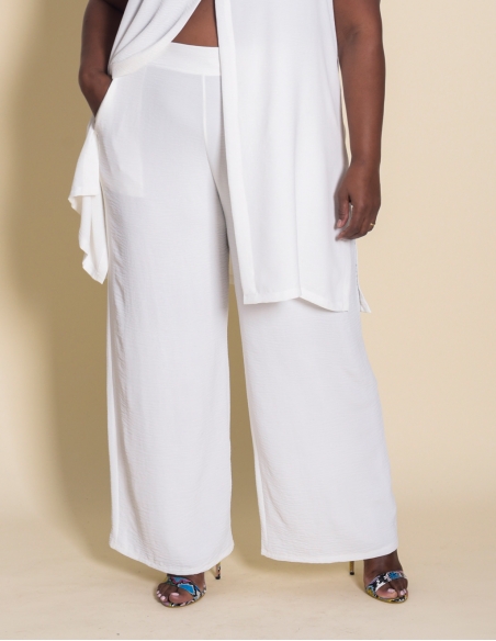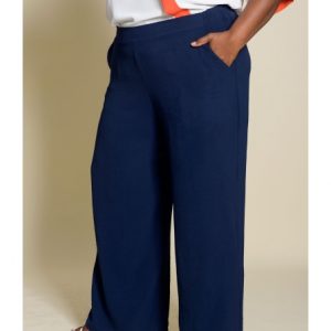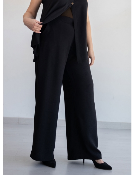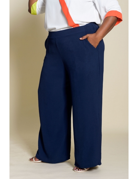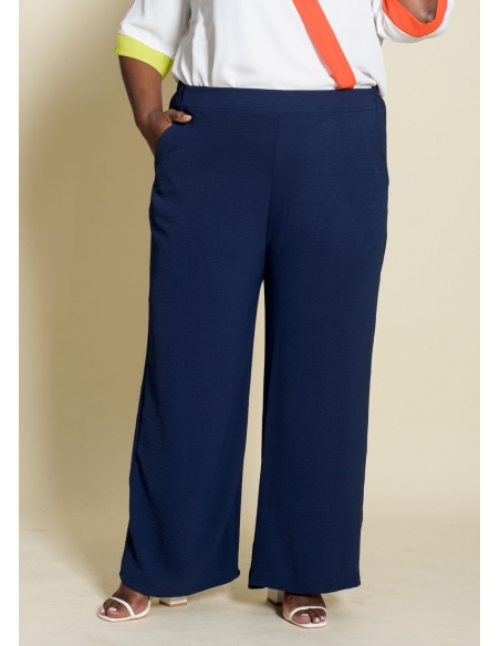 Pantalón largo ancho confeccionado en tejido de plana tipo crepé, muy suave y ligero para ofrecer comodidad durante todo el día. Modelo con bolsillos funcionales y cinturilla trasera elástica que garantiza un ajuste adaptable y cómodo. Su corte amplio favorece la movilidad y es ideal para tallas grandes. Un pantalón perfecto para el día a día, confeccionado en España y pensado para mujeres reales.