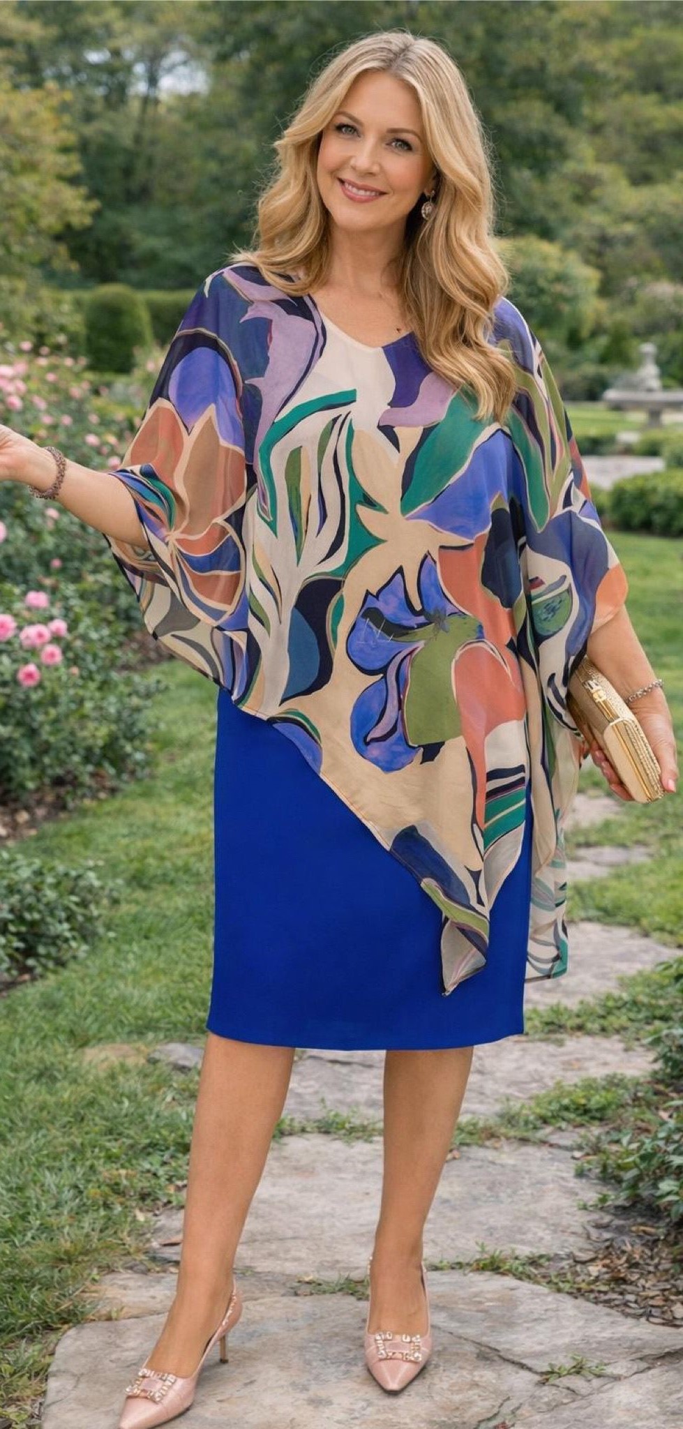 Precioso vestido liso con capa asimétrica estampada de gasa y, cuello en uve.