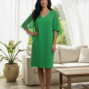 Elegante vestido para ceremonia en color buganvilla de corte recto y, con una capa asimétrica rematada con pasamanería con pequeños toques de lentejuelas.
