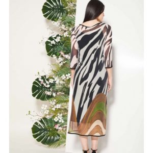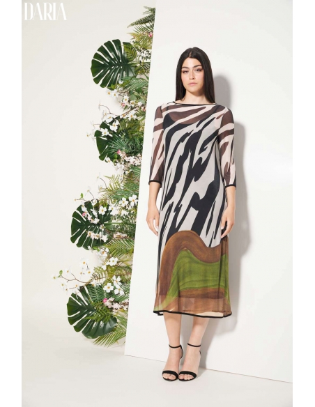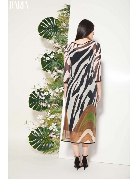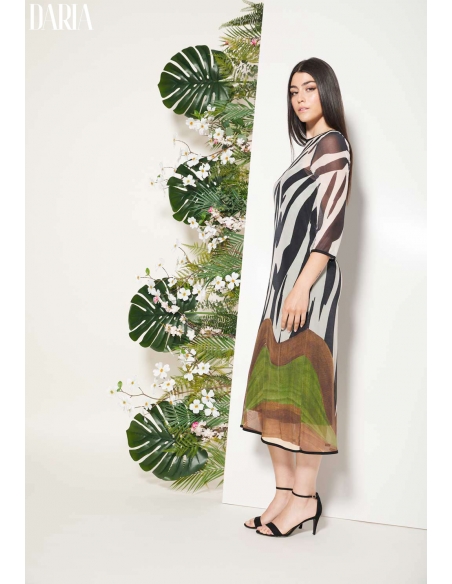 Vestido midi de tul con estampado posicional, diseñado para crear un efecto visual cuidado y elegante. El escote barco y los puños con ribete de terciopelo aportan un acabado sofisticado, mientras que el bajo equilibrado completa la silueta. El vestido interior negro de viscosa asegura comodidad y suavidad al contacto con la piel. Una pieza especial, ideal para ocasiones en las que buscas un look femenino y distinguido.